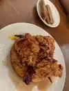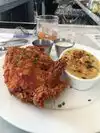 Food is good, fried chicken was cooked perfectly. Side of gravy and hot sauce were great. Dessert and wine were good as well. Patio is wonderful!
