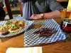 Go to the bar for a menu and read about the craft ales. I personally had the spicey steak baguette, very tasty with lots of filling. Seemed a poular place for a stop off, would recommend.