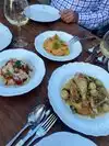 Wine and great pasta and some small appetizer plates and desserts as well. Beautiful wine list. Beers too. Rabbit ragu over paparadelle was spectacular. Risotto type rice dish with beans and prosciutto was also excellent. Service is spectacular and ambience is lovely. Olive trees grow within. Pricey, but oh well. Worth a visit