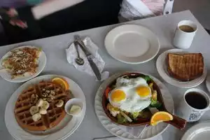 We were with a huge group (over 20) and waited quite a while, but that's to be expected. I ordered a cinnamon apple waffle, and was disappointed to find it had five slices of raw apple and a dusting of cinnamon. I don't know if I misread the menu or just made assumptions. I expected a warm, cooked, apple-cinnamon topping. Anyway, the waffle was good with butter and syrup. Two of us went back another day for lunch. I had a BLT sandwich with hash browns on the side. Both were very good. They also have good hot chocolate with whipped cream.