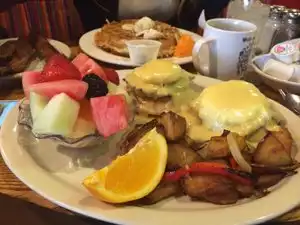 It was a wait to get in with many travelers enjoying the leisure mood of this Cafe. There were certainly plenty of choices on the menu to satisfy anyone's taste. I chose the Eggs Waffle Benidicts with country potatos. I think it was an excellent choice. The waffles were thich and fluffy with a good malty taste. The poached eggs were cooked just right with LOTS of runny yolks. And the Holendaise sauce was hot and flowing. All that yolk and sauce got stopped up by the country potatos. All to make a good, filling breakfast. If like to complain about the other diners who tied up a table long after they were finished eating while many waited in line to be seated. But it would do no good as it was not the restaurants fault. So here is my review Picture just as they should be.