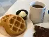 I stayed at a nearby hotel whose restaurant didn't open in time, so I walked over to this place (hiding in a rather nondescript hotel). I'm not a big waffle fan, but they had a great selection of breakfasts. I had a Canadian bacon and eggs breakfast, and asked them to burn the hash browns (I like 'em crispy). And they did! I ordered the waffles instead of toast, and what they brought were two tiny, roughly muffin-size malt waffles. Just about a perfect complement to all the salty/fried food on the main plate. Service was OK, and overall, I had a very pleasant experience. I'd come back if I were anywhere close.