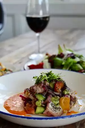 Sólo night Every dish was artistically presented to the table. I decided to order two appetizers as my dinner. The were a delight. With every bite, I was transport to Costa Rica... the coconut, the sea food, the fried taro root, the guava ... I ordered the Big Eye poke (speciality of Tidal as the chef adds coconut to this dish), grilled spanish octopus and chocolate coconut guava cake and cappuccino for dessert. The vie is beautiful, my server was Landon, he was courteous and took care of my dinner giving my dinner a touch of elegance and prestige. This restaurant is a Jewel to Paradise Point.