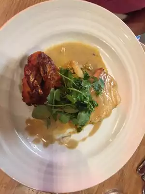 We were greeted by a cordial host. Seated, and waited for our daughter to arrive. Enjoyed a glass of wine and their truffle butter popcorn. Delicious. Dinner was a salmon dish for my wife, pork chop for myself and shrimp and grits for our daughter. All three were outstanding. Chef came to our table and my wife described how good and well cooked her salmon was. I would recommend this fine restruant to anyone who can afford it. We spent approximately $50 per person plus a generous tip. Wait staff was as good as the food.