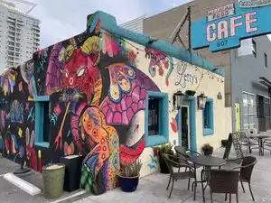 Funky restaurant with amazing food, outdoor seating, friendly service and the very best artichoke heart sandwich I've ever had. Crisp, flavorful, fresh!