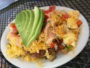 My wife and I stopped by Tin Shed for brunch on way to airport. My wife ordered the Spiked Burrito which was extremely tasty, I ordered the You gotta have it 2 eggs with bacon, cheese grits and biscuit, everything about this was excellent, the bacon was thick and crispy, the cheese grits were delicious and the biscuit was fluffy and light, The food at Tin Shed was fantastic