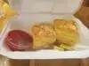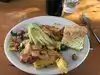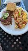 I would have given it 3.5 stars. Here is my take: Coffee. Good no after taste Jam Very Good despite looking weak Chicken Sausage. Good, though not something I look forward to having again. Eggs. A bit rubbery, compared to Milo's or Jakes which I had just last week, (Cook in butter?) Biscuit. Dry, heavy but the jam saved them Potato Cakes. Awful, tasted like full of sour cream they were so soggy The scrambles looked interesting, but they all had too many strange ingredients for a picky eater to try. If you live nearby, probably worth going back to find what they do well. Biscuits? Probably cheaper than bread, or feeding a toaster, otherwise why no choice?