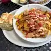Made from scratch with love and roasted garlic! We had a wonderful breakfast on the patio with our son , daughter-in-law and their dog. This fun spot has delightful music and a walk up coffee/tea bar (inside) with picnic tables on the patio. I ordered the Stay over potato cakes with the rosemary gravy. The biscuits melt in your mouth!! My hubby ordered the Killingsworth over grits with the bacon gravy. Best breakfast ever!!