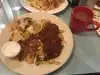 Really busy buzzing place. Huge plates of food. Great staff. All good. Pastrami and eggs and of course home fries. Rita had Mexican omelette.