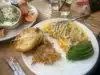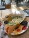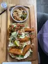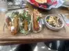 Sat outside, table way to small for plates and glasses to eat comfortably. Had to juggle drinks and food. I had fish tacos. The fish looked like a fish stick hidden under condiments. Corn was cold. I've eaten here in the past but its gone down hill. Won't recommend.