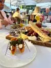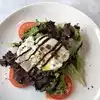 We went for a late lunch on this beautiful day. There was fun music in the outdoor seating area. When we entered the hostess was short tempered, seemed hurried and informed us there were no tables outside. It would be minimum 45 minutes. It was 2:00. So we opted for a nice table on the patio behind plastic sheeting. We did have a nice view. We noticed three tables empty and clean outside. Over the next hour, we watched people being seated at the three. Our server brought our menus which were brunch. When I asked if we could order from the menu on display outside the restaurant, she said they only have the brunch menu today, but I could have whatever I wanted. When I asked her to what that meant, she said I could order whatever I wanted (???). I’m not sure if I should make something up or get out of my seat, do outside and look at the display menu. So we started with a glass of wine and fried calamari which had wonderfully fried fresh vegetables along with calamari (tough, not edible). My wine took quite sometime, and after the server poured the wine into a very pretty bell, I noticed lipstick. I sent it back. She returned quickly this time stating she had gotten me a new glass and new wine....as I would think she would. I ordered carpaccio with grilled vegetables, and my son had salmon. He said his fish was the best he’d had in a long time. The vegetables were soaked in butter. My carpaccio was good, but not much flavor. I added salt. After we finished our food, the server informed me that the kitchen had sautéed my vegetables instead of grilling them, was in the process of grilling them now, but since we were done, I wouldn’t be required to have them. That was fine with me. All in all, the restaurant was nice. It would be a fun place for afternoon cocktails. I’d skip the food and recommend you expect attitude and nonchalance from servers. I’m not sure we will return unfortunately.