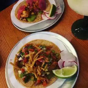 We stopped in for a late but quick dinner bc we were in the area and ordered street style tacos and some apps. The street corn was delicious as were the chicharrones. The carnitas were especially juicy (not dry) and I loved the Baja fried fish taco. The tacos only come with one tortilla that is slightly bigger than street tacos. My friend had the jackfruit tacos and they were too sweet for my taste. All in all it was a fun night out with friends.