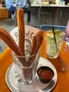 We came here for an early dinner before a party. Although we arrived at 5:30, it was already filling up. The interior is fun, lively, and not too noisy. The servers are friendly and attentive. Most importantly, the food is good, especially for those of us who like our food spicy. We had the chips and guacamole first. Chips were hot and fresh, and the guacamole was zesty and spicy, with sliced jalapeños on top. It was a far cry from the bland, generic mashed avocados other places call “guacamole.” We then shared the chicken quesadilla, which was stuffed full of chicken, juicy, and with enough spice to keep it interesting. The aioli was fine, but I liked it better with the house hot sauce. We each had an avocado taco. I had a steak asado taco, and my husband had the beef barbacoa taco. We asked for them on flour tortillas, because even though we like spicy food a lot, evidently we also still suffer from terminal whiteness. But the server was happy to accommodate this request. The tacos were great! The avocado was fried and served with a spicy chipotle sauce that delivered tons of flavor. The two beef tacos were juicy without being greasy, and did not need much sauce; the flavor stood on its own. We thought we were finished, and even paid the check, but then the table next to us got churros, and we had to order a plate for our table. Worth it. They came piping hot to the table, with chocolate and strawberry dipping sauces. I liked both sauces, but honestly, neither was as good as just the hot churro by itself. It melted into my mouth like a burst of sugary love. The perfect end to a very good meal. I definitely recommend for a nice, casual, and indulgent meal.