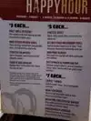 Happy hour has great deals for food and beer, a pint is 2 bucks. we had the nachos which were good and big for the price, the wings which were OK and the mushroom fries which were also good. Bottom line food is good but the prices are great.