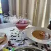 The food was excellent and the service good, with a couple of exceptions. We ordered salad with no tomatoes. We got tomatoes. We each ordered soup. He brought one to share. And every server kicked my chair when they walked by.
