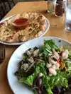 I've found the perfect combo at Tutta Bella to be the Flatbread appetizer along with a small Mista salad. The charred flatbread is so flavorful with olive oil, rosemary, and cheese. It comes with a crushed tomato dipping sauce. The salad ingredients are fresh and the amount of dressing just right. The restaurant is quite large, with a bar area separated by glass. I like to go for an early lunch when the restaurant isn't too busy. It seems to be a great spot for families with young children and family gatherings.