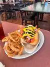 Found this place on accident! We did dine inside due to the heat. My husband enjoyed his Chicago hotdog, our guest liked her 1950 plain cheeseburger but didn’t care for the sweet potato fries. I liked the fried apple, blue cheese, bacon Chicken sandwich. I should have asked for the bun to be toasted, that would have made it better. Couldn’t taste the apples at all, but the bacon was good. Onion rings ok. Not a cheap lunch by any means, sandwiches were approx $18.00 each.
