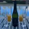 Walked over to local place for evening drinks. Many families and groups eating inside and outdoor patio. Sat at sticky wooden picnic table with bench. Rushed server.