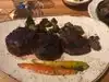 If you are a carnivore, this is your place! They have a wide variety of steaks (along with non-beef selections) for you to choose from. All of their steaks come with a short description on the menu, indicating if the steak is grass fed, grain fed, how long it has been dry aged and where the beef comes from. We ordered the ‘steak sampler’ which gave us a choice of three 6oz strips. I choose a grain fed, a grass fed and a 21 days dry aged and was not disappointed at all. The steaks were done as I like the, rare, served hot. They were well presented and the waiter explained which steak was which on my choices. The rub used did not in any way take away from the taste of the meat. We also ordered sides of braised carrots and mushrooms with carmalized onions. Our knowledgeable waiter told us that sides were family sized portions and we had plenty to go around. Service was prompt and the waiter was very attentive. Excellent all the way around. It should be noted that UF is $$$$. Reservations are suggested and there is outside seating. I would suggested dressy casual but that is not a must. If you like steak, this is your place!