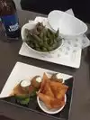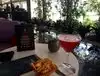 The drinks were great. The server brought a small selection of snacks for us to have with our drinks. Comfortable seating, quiet, plants and small pond.