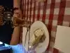 The waiter actually encouraged us to downsize our order as he said one pizza each would be too much, so we shared a large medium sized pizza with half and half topping. It was tasty but very runny - a lobster bib would have been helpful!