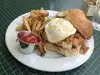 After a bike ride along Forbidden Drive we enjoyed the food and ambience of our lunch today. The smoked salmon salad was delicious. The salmon was flavorful and the dressing a perfect complement. We decided to share a side of sweet potato chips made in house. A large basket of chips arrived. I was sure that we would need a doggy bag. But the thin, sweet, crispy chips were so perfect, that we ate them all. The interior of the Inn is tasteful and interestingly decorated with historic items and paintings. We appreciated attentive service. And last but not least is the perfect setting along a shaded trail and rocky stream.