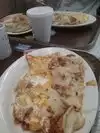 Eat here and you'll have the fasted cooked breakfast of your life. You order, go through the line, and breakfast may be cooked by the time you pay. Place is noisy, atmosphere is casual, and the food is good and cheap.