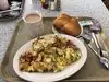 I go here twice a week. Easily the cheapest good breakfast option in the area. I've never had non-breakfast food here, or been here later than nine am. Lunch may be a completely different world. A couple things people may want to know in advance: • The place is cash only. There is an ATM on site. There—oddly—aren't many other ATMs in the neighbourhood that are easily accessible. • This is a diner. It is not a rustic diner. It is not a cute diner with nostalgia-inducing décor. It's a diner, bro. You get a tray, walk down the line just like you did in your middle school cafeteria, & then you sit at a table in a large, plain dining hall. You do not have time while you're in the queue to hem & haw over your breakfast decisions. (It is possible to stand outside the line & stare at the menu for a *little* while, but the line needs to keep moving.) You're not going to impress your boyfriend with the ambience. (You could have a nice breakfast date here. But not with a fancy mother-effer*. You should break up with him anyway, by the way.) • You can choose the components of your breakfast, but this isn't the kind of place where you can make a lot of fancy substitutions. You *might* be able to swap out items in a menu omelette, but seriously: They're doing rapid business on an assembly line for a large number of customers. They're shouting out orders. They're not writing things down. If you *really* need a Denver omelette but could you get broccoli instead of green peppers? then maybe you should go to a different sort of place. Or, like, stop being so damn picky. It's good effing* food: Eat it, dummy. My standard is two eggs, hash browns, coffee, & orange juice. That comes to about $8. I think when I wasn't getting the OJ it was $6. This is very good for the area. A comparable breakfast at another nearby non-fancy breakfast place is $15 before tip. The coffee is decent—good for large percolator diner coffee—but it's by no means fancy. The food is of good quality for the price—again, by no means fancy. This isn't a place where you go for a culinary experience, but it's real, solid food. *Tripadvisor won't let me cuss, the brother-truckers.