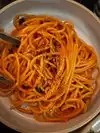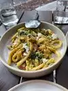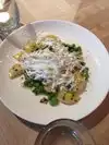 First off, did not appreciate immediately being offered bread and olives (YUM, who would say no?), but then find out bread is $5 and olives are $4. Seems like very heavy handed upsale! No mention was made of the price and it was offered before we had a moment to look at the menu and see the cost. First dish came before we even ordered drinks (WAY too early) and then the 2nd dish (pasta), took over 30 mins. They could work on their timing! However, the staff was super friendly and nice. It is VERY noisy! Lighting made it very hard to read the menu and I noticed folks on both sides of us had the same problem. Pasta (what we came for) was mixed. An amazing (!!) delicious pasta with a rich lamb sauce was delicious! Really wonderful and nice sized! The other pasta (tagliatelle) with crab was dull - lacking flavor. The pasta itself was light and nice and perfectly textured, but there was scant crab and it was clearly tossed in at the last moment (it was not hot) and the whole thing needed more flavor -- there were a few herbs..not nearly enough. The crab flavor did not go beyond the crab. Even just salt and pepper (not on table) would have helped and certainly more herbs. I appreciate simple flavors.. but this was too simple. Likely the FIRST time I've even left pasta on my plate. Very good wine! Not sure I would return (since it is across town for us).