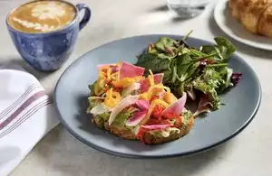 Great spot for classic brunch items. The front of the cafe is so picturesque and bright that its almost like they built it with IG and tik tok in mind. And quel surprise there were women posing and taking photos to upload, no doubt. The brunch menu is available during weekdays and combines breakfast and lunch items which is always the best. If you want a casual coffee and muffin spot, sit up front. Great location off of Michigan avenue and it would be great for just drinks at the bar too. Great new place on Michigan avenue. Thoroughly enjoyed it.