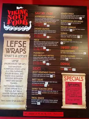 I came here after reading some interesting reviews and articles about the place. I was going to order a standard wrap called the Norwegian Meatball, but then they offered one which had a funny name called, "The Booty of the Sea" wrap if I remember correctly and it was excellent. It had pink shrimp, cucumber, cherry tomatoes, toasted almonds, and greens wrapped up in Lefse. The Lefse here is thin and delicious. The wrap made for an exceptional meal. Really refreshing and invigorating! It was really a unique experience after having a strange dream the night before about this beautiful, chocolate craving, beer swilling, tattooed green belly and her super cute dog and they were both dressed up like Falco in his video singing Der Kommisar. It was very bizarre, but they sounded just like him. That dog is a great dancer. Anyhow, my meal at Viking soul food seemed to be the perfect capstone in the recovery and interpretation of the dream. I felt like the Prophet Daniel. I highly recommend Viking Soul Food. It is on Belmont street and you have to drive slowly or you will miss where it is. It is tucked off the street in food cart pod that has a narrow opening It is much bigger once you walk through the narrow opening, but if you are driving a car you need to park in the neighborhood and walk in.