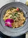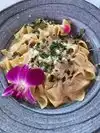 Great food and ambiance! You can choose to sit inside or outside. I sat outside and found it enjoyable. The outside tables were segregated enough to where it felt private enough yet I could people watch. The restaurant was recommended to me for its cheese wheel pasta options and it did not disappoint. I took off 1 star because I feel I was “tricked” into buying a $7 bottle of water… As soon as I sat down I was asked would I like Still or Sparkling water. I stated I wanted Still water which I assumed would be just tap water. When a table next to me specified they want “just regular water” I realized I was going to pay… Food quality is good though so I would go again
