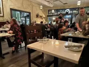 We were a large group for dinner. They had a nice table arranged and handled our group very well. The restaurant is in a charming location and very nicely decorated. It has a cozy and casual feel. Parking is on street. We tried a number of items off the menu and all were delicious. The pizza was really great and we also very much enjoyed the hummus. Even dessert was good. Prices seemed quite reasonable. We would be happy to go back and enjoy another dinner.