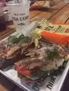 One of us had a special blackened fish sandwich and chips, the other had crab cake, coleslaw and French fries. Sandwich was okay. Crab cake was good but smallish. Fine for me but others might not be happy with the size. Coleslaw was good and fries were great. Order inside and someone brings food to table. Nice staff. Ate outside. Rustic and covered.