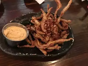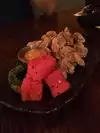 I had never heard of Karaage before and saw good reviews so I figured I would stop in and try it since I’m not a big ramen/soup fan. This did not disappoint and the small plate was large enough to be a meal for me. I intended on ordering more but there was no room in my stomach for it lol. The chicken isn’t greasy at all and has a nice flavor (reminded me of chicken wings done right at best hole in the wall Chinese restaurants) the aioli had a nice kick too it and the watermelon had some type of spice on it that complimented the chicken. Take a bite of the pepper it’s served with for some extra spice. Very quick service. It came out in about 5 minutes and my waitress kept my glass full.
