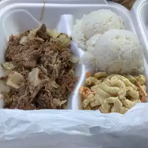 This was such a treat. I was visiting my family and we were snacky so we went here. The restaurant was small but cozy. I love the pics on the wall. The staff was kind and explained the difference in the kaula pork and spicy pork. I choose the spicy pork. It wasnt super spicy it was just right. My brother had the smokey kaula pork which was good too. My sister had the bbq plate #1, tasty too. My brother praised the macaroni salad. I loved the rice with terriyoki&saracha sauce was soooo good. I will definitely be back the next time Im in town.