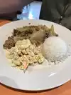 Good basic Hawaiian style plate lunches. Two scoops of rice, one scoop macaroni salad, and a protein. Reasonably priced. There are typical Hawaiian street food specialties such as Musubi (with spam or other meats). People eating there were a mix of ages and ethnicities, much like Honolulu. We ate outside on the patio, quiet enough to talk with our daughter and her boyfriend. I would eat here again. Honest food at a good price.