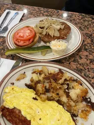 We came here for a late breakfast and ended up with an eclectic array of entrée s. The service is GREAT. Water and menus immediately upon sitting down. Water glasses refilled a few times while we were there, too. Special order was not a problem. Bathrooms were clean. The menu goes on and on. Breakfast foods, soups, salads, sandwiches, fish, all types of dishes. We had eggs and corned beef hash, with home fries and toast; chicken fingers and fries; and Challah french toast. The chicken fingers were large and there were eight of them. Lightly breaded and not overdone. The corned beef was good (I was told). And the French toast was absolutel delicious and done perfectly. They served three large pieces. We left there with full tummies and we couldn't eat all our food.. Three hot beverages along with HUGE meals cost us $36. We thought that was very reasonable.