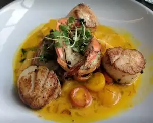 What a lovely surprise! Fun bar area and delicious dinner. We had the citrus salmon and the seared ahi tuna. Both were Perfectly prepared. Staff was helpful and attentive. Nice place-