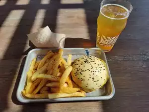 Came here to check it out for a potential happy hour event. Ordered a cheeseburger, fries, and a german-style pilsner. Burger was pretty good, but a bit small, fries were crispy and well seasoned, and beer was good. There's an indoor and outdoor area including a stage outside for music. You can also see the brewing equipment in the back area. Overall it was pretty good.
