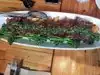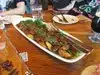 Nice place with great service and tasty sharing food. Started of with cold cheese and meat cuts, the burning cheese was nice, pork belly tasty and some mac bites. The cut steak and whole fish we shared for the main with fries. Great choice of wines. Not cheap but great service and very tasty food.