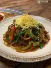 Pre-theatre dinner on a June weekday by myself. The service is fabulous. Got a table by the stairs; a glass of ice water and a waiter arrived within the blink. Ordered the mushroom bibimbap and the banchan arrived with someone to tell me what everything was(!). I didn't try the mashed potato; the kimchi had heat and refreshing crunch. The pickled jalapeño plus didn't have enough heat for me (later, the gochujang sauce was similarly lacking). The steamed broccoli banchan was off the charts! Later the waiter noticed I'd eaten all of the broccoli and brought me more. The hot stone bibimbap came really quickly and was sizzling - it was very hot. The egg was cooked a little more than I like, but that may have been the ambient heat from the sizzling bowl/food while the waiter explained to me how to prepare the dish ("Put the sauce in and stir it all around!") and I taste tested the gochujang sauce. By the time I dumped most of the sauce in and broke the yolk, it was nearly fully cooked. Because I didn't order a drink, the check was less than $20 and I left a fat tip.
