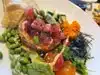 Ate here this afternoon during a Braves game (it was hot outside). Ordered the tuna as an appetizer along with another appetizer. Ordered tacos for the meal. The tacos came before the appetizers; other than that, everything was great.