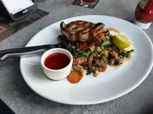 The Thai pork chop was good but the cauliflower “rice” was so so so so salty it was not edible. I was bummed bc I was looking forward to all the veg. On the other hand the service was good but a little weird with the “computer “ assist with ordering. Also!! We played one stupid game of tic tac toe for fun and they CHARGED US $3!!!!! No note no message saying there was a fee bc if there were we wouldn’t have played. That sucked!!!