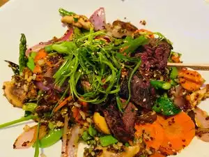 First time. Pleasantly surprised at the overall quality and inventiveness of the menu. Sometimes these East/West mashups work, other times it feels like the kitchen is being spread too thin trying to deliver on menu items from two different worlds. THIS ONE WORKED! Food Started with lettuce wraps and mac and cheese bites. Both tasty with a nice accompaniment of sauces. One portion issue was that the lettuce wraps were lacking in lettuce, but a quick request to our server remedied that situation. Mains ranged from the lamb burger to the poke bowl. This is where the restaurant shines. Both were prepared as ordered. The burger came with a choice of fries and the poke bowl was just beautiful with all the different layers of greens, fish and a nice crispy rice cake. Ambiance Sound levels were a little loud at lunch, but it could be because we were seated next to wall speakers. Good space between tables. Nice bar area. Value For Seattle, not bad. I like that you can make reservations for lunch. For 3 of us with 2 appetizers and 3 mains, no alcohol, bill came to $90 before tip.