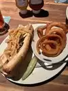 We had the chicken and steak cheesesteaks with fries and onion rings. Both sandwiches were very good with lots of meat and cheese. The fries and onion rings were very good also. Portion sizes are very large--most people could split and order. Servers were great--very attentive and quick to return with requests (ketchup). The table has those small electronic tablets on the table for special requests and paying the bill. Tables are spaced far apart and there are sports on all the TVs mounted around the room but the restaurant is very loud. This is not a quiet place to catch up with friends but it was very good for a bite close to the hotel.