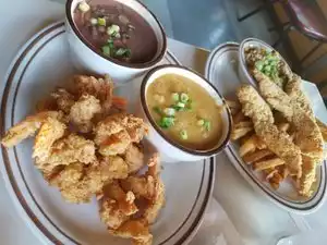 We tried the fried shrimp basket at this diner today. The shrimp were medium size but very tasty, the fries crispy and the rice jambalaya was fabulous. The jambalaya had pork, sausage and chicken in the rice....all seasoned just right. This is a casual place in downtown Houston. It does have a parking lot for customers. Service was friendly and fast. They also had baked chicken as one of their lunch entrees today. You get to choose 2 veggies to go with the meat. Also, the big squares of cornbread looked great.