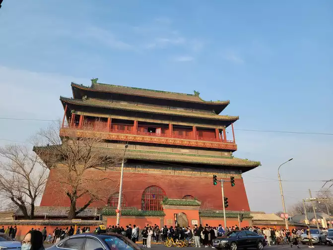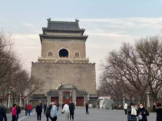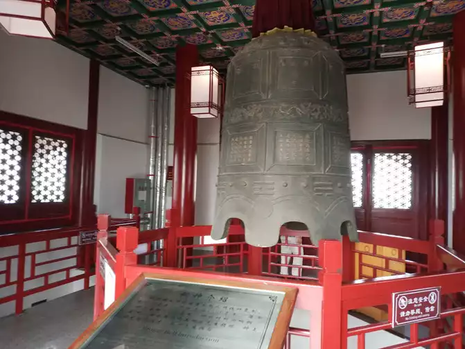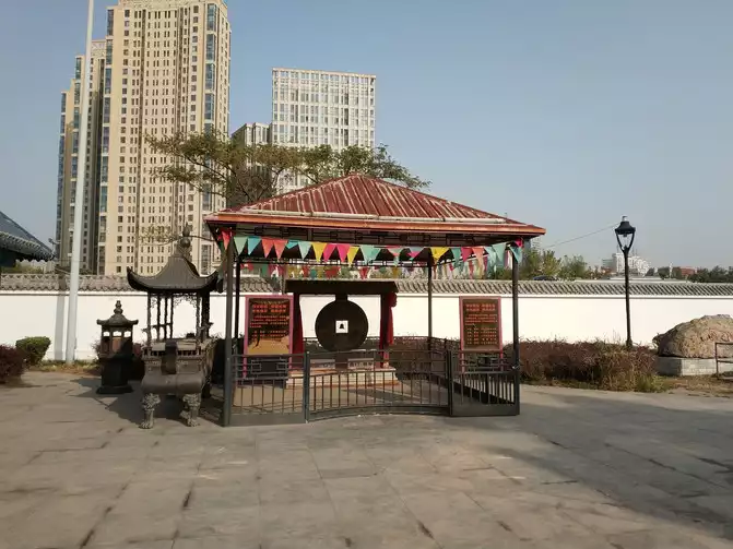 After exiting, we cycled north along the wide avenue and arrived at the Drum Tower, located in the city center. Although it is called the Drum Tower, it is actually a bell tower. The Drum Tower stands three stories high. The base is a square brick platform, wide at the bottom and narrow at the top. It features four arched doorways, providing access to the four main streets. Atop this platform, two stories were built. The first floor is dedicated to Guanyin Bodhisattva, the Queen Mother of Heaven, Guan Yu, and Yue Fei, among others, and houses an exhibition on the history of Tianjin. On the second floor of the Drum Tower, a plaque with the inscription "Sounds Heard in Heaven" hangs outside. Inside the tower hangs a 300-jin iron bell. Measuring 1.4 meters in diameter and 2.3 meters high, and weighing approximately 1,500 kilograms, the bell is known as Tianjin's "King of Bells." Cast from iron, it boasts intricate craftsmanship and a simple, ancient design.