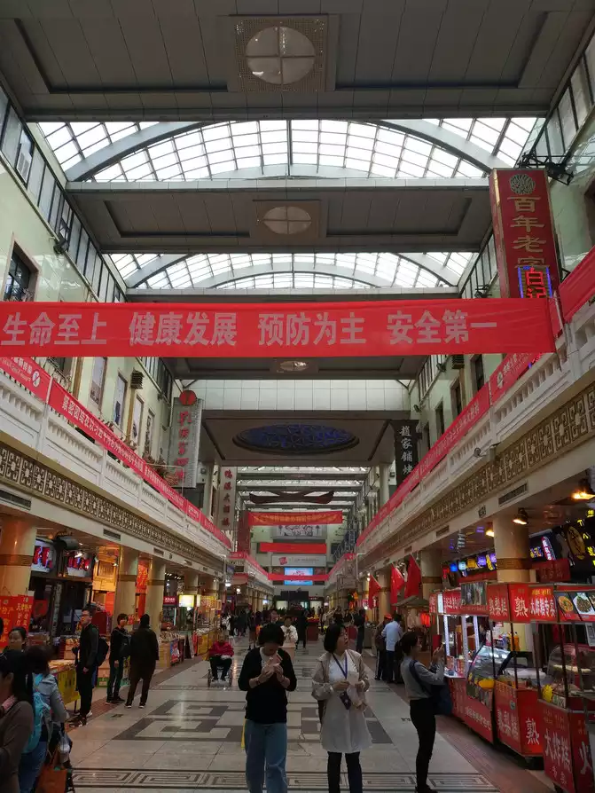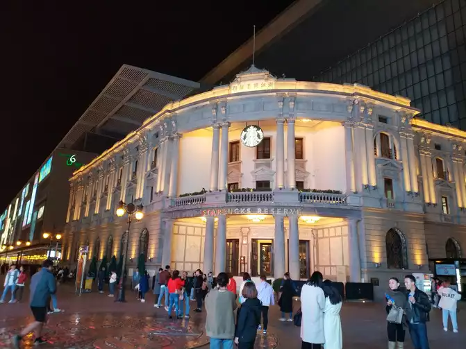 The building is two stories high, with set meals on the first floor and à la carte dishes on the second. Our main purpose was to try the Goubuli steamed buns, not stir-fried dishes, so we ordered the 88 yuan set meal on the first floor, which consisted of a basket of steamed buns, two side dishes, and a bowl of millet porridge. After eating, my wife finally understood why it's called Goubuli steamed buns. They truly live up to their name; they're something no dog would even bother with! They tasted worse than any other buns in southern China, but she also experienced their three key characteristics: fame, high price, and awful taste! But the brand's value lies in the fact that, regardless of the flavor, most tourists visiting Tianjin come here to try them, so business is brisk and visitors flock to the area. It's very close to Binjiangdao Pedestrian Street, perfect for a quick stroll and some food. I saw plenty of food stalls, and the popular Eighteenth Street hemp flowers, one of Tianjin's three specialties, were everywhere. I'm sure several people would share a single hemp flower. Amidst the bustling crowds and dazzling neon lights, the architecture of Quanyechang, a classical European-style building, is simple yet majestic, its golden lights accentuating its grandeur. "Each one should encourage his own business and enjoy his work." Here, "encourage" means "to work hard," though some believe it also means "to encourage." Quanyechang, a place dedicated to encouraging commerce and industry, is one of Tianjin's iconic landmarks. Across the street, there's an old building—Zhejiang Industrial Bank—with a Starbucks sign at the entrance. Stepping inside, you'll discover a perfect fusion of European historical architecture and coffee culture. The former Zhejiang Industrial Bank building, a European-style structure that stood on the banks of the Haihe River for nearly a century, overlooking Tianjin's bustling commercial district, finally welcomed Starbucks amidst the vicissitudes of history and times.