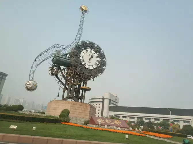 The Drum Tower houses an exhibition hall dedicated to the history of foreign invasions and occupations of Tianjin. The view of Tianjin from the Drum Tower is hazy, perhaps due to the excessive smog index. After lunch at a restaurant along Gulou Street, I wandered around and wanted to explore the adjacent Gege Mansion, but it was closed. Tired of strolling around, I took a taxi back to rest. I was struck by the impressive mechanical clock on Century Clock Square by the Haihe River. Its minute dial, pendulum, and base are all made of metal, gleaming with color. The sun and moon reflected the clock's movement as it moved up and down, a fusion of Eastern and Western elements.